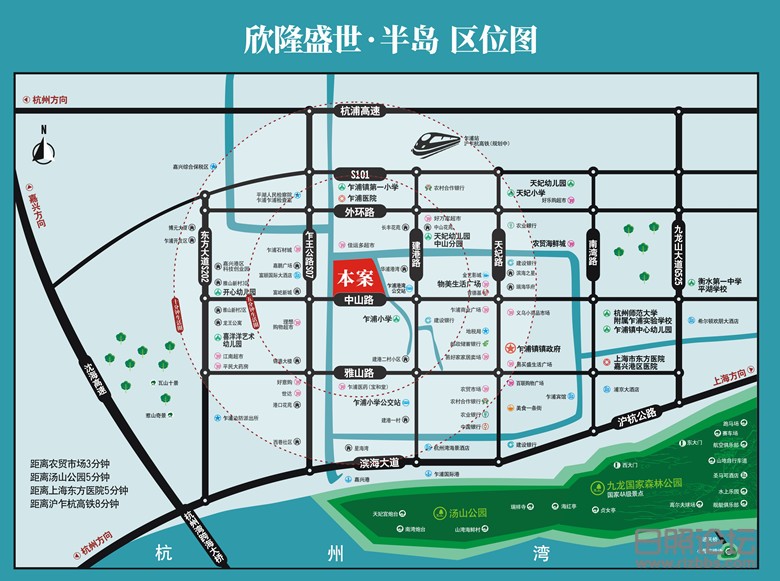 交通优势:S101省道、G15/G60高速交错,杭州湾跨海大桥,规划中的沪乍杭高铁/沪平城际铁路,规划地铁5号线延伸段,上海一小时城市圈、规划嘉兴机场