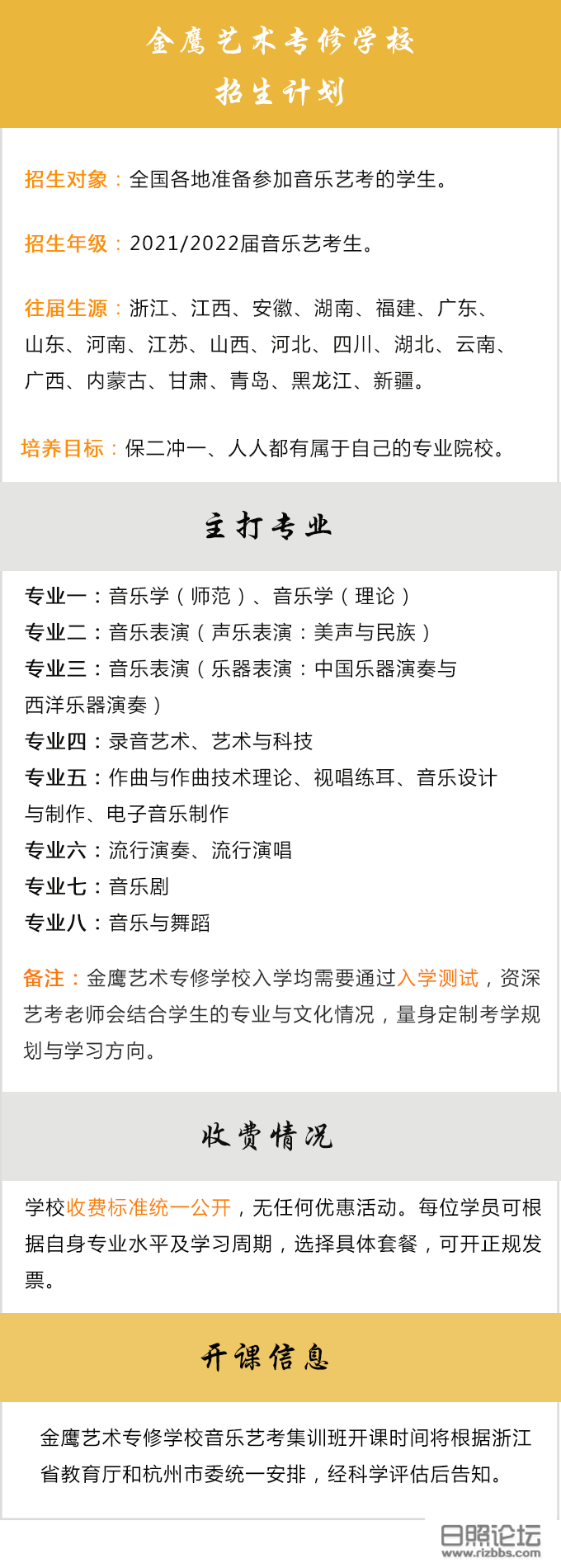 杭州金鹰(杭州杨妈艺术培训)音乐艺考集训班面向全国新高三、新高二、新高一招生。入学测试帮你摸清专业水平,根据水平帮你明确音乐艺考方向,量身定制考学方案,让你的每一天集训都达到最高效率。你还在等什么呢?